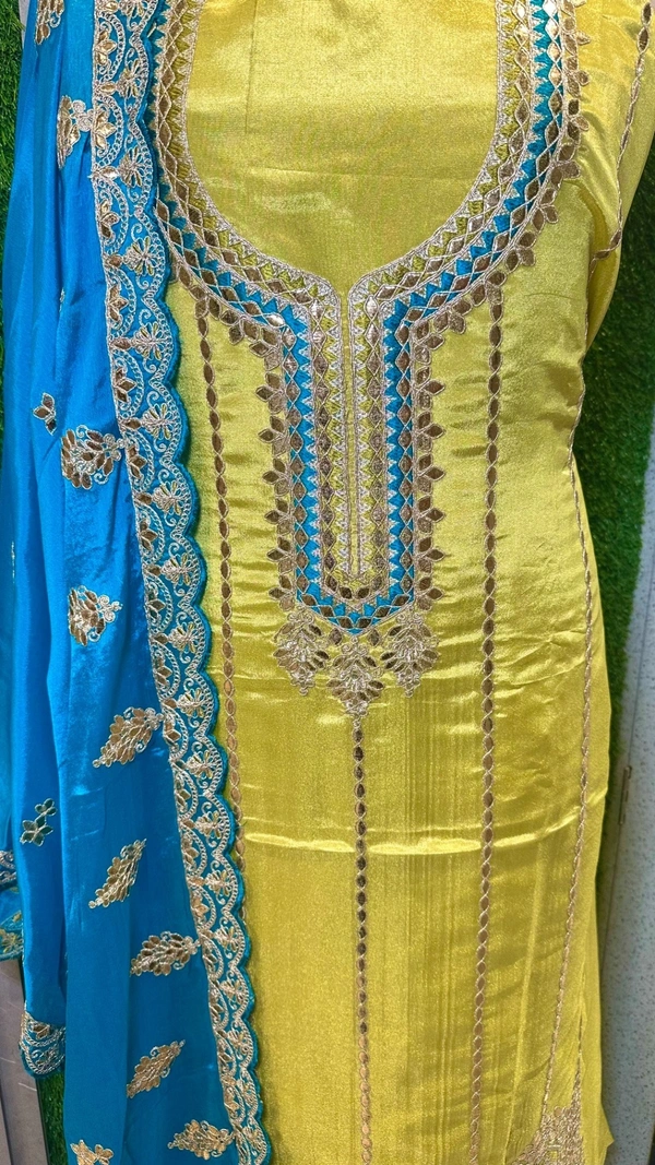 • TYPE OF EMBROIDERY- GOTTA PATTI WORK WITH ZARI AND THREAD HIGHLIGHTING ON SHIRT AND DUPATTA IS WITH FOUR SIDE SCALPING. PROPER PUNJABI SUIT.